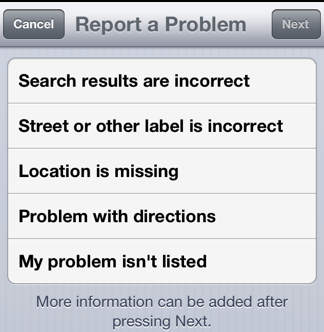 When iOS 6 initially was released, and it had this bad map data, I was disappointed. After all, it had been wrong for years in Googles map dataset, and only just got fixed. What the new Apple-derived maps application had that the old Google one did not, however, was a way to fix it. Right in the application, “Report a Problem.”