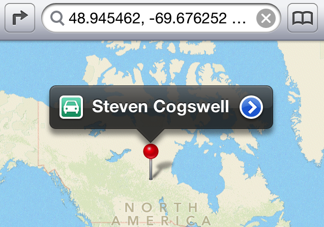 Which makes it even more useless than being six kilometers away, now it’s about a thousand kilometers away. Even better: Apple’s Maps actually understand the coordinates, because if you go into the field at the top of the app and backspace over “Canada” and re-submit it, it works correctly. You can’t remove the Canada from address book, though, and address book is where all the queries for “home”, “work”, “geo”, “dog pound” go through.