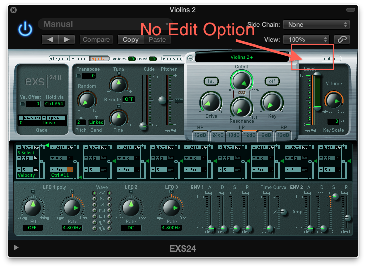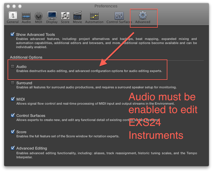 Anyway, easy solution: Go into the Logic X Preferences, and under “Advanced” you can turn on the “Audio” selector, that will enable editing EXS24 instruments again.