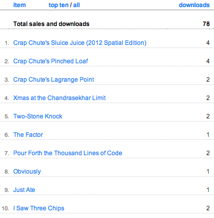 Total revenue from all sales: $157.88 from sixteen discrete sales. All the sixteen sales were to three individuals. I won’t name them, because they’re silly people who paid for stuff they could have for free, but I will say thanks very much. $157.88 is my “net from Bandcamp” figure, because Bandcamp does “revenue sharing”, meaning they keep 15% of the sale price. Also there’s a little bit in paypal fees lost.