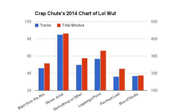 Last year I dumped Soundcloud, and they didn’t want me back, so I don’t have to worry about summarizing any Soundcloud stats. All my music has been available on Bandcamp for a couple of years now. In late 2013 I started using Distrokid to put my music for sale on iTunes, Amazon, Google Play, Spotify, and a whole host of services I can’t even access because I live in Canada. Spotify at least came to Canada this year, so I could see if that was working. 2013’s Crap Chute’s Pinched Loaf and 2014’s Crap Chute’s Box of Devils got to those services via Distrokid. Albums from previous years (2009-2012) albums are exclusive to Bandcamp, mostly because I’m lazy. Bandcamp remains the best/cheapest way to get all the material anyway.