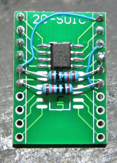 I put on a 0.1 uF capacitor, as recommended (ADT7310 needs it), and the two recommended pullup resistors for the alarm pins. I don’t know if the chip works just as good without the pullups, but it was easy to put them on. Shows how small this package is when it’s dwarfed by the through-hole resistors. In a better design you could use some SMT chip resistors.