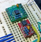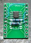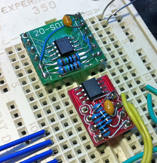 To solve this first problem, I used a couple of different little SOIC-pin header adapter boards. The first couple I built I adapted from a 20-pin SOIC board I had lying around, so I cut the board short with a dremel. Nice but the spacing is wide, so it covers lots of holes. A later one I use some really sexy small adapters from Sparkfun. $2.95 was a little much, but still cheaper than making my own board.