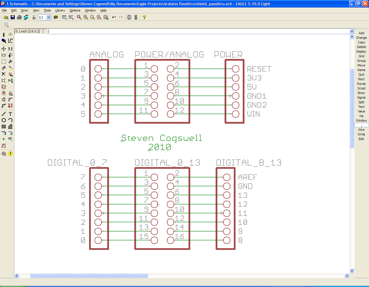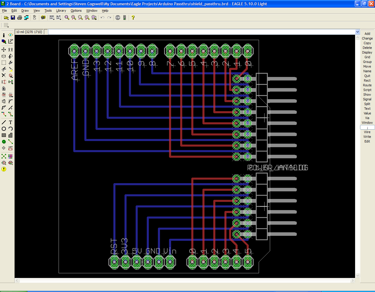 I started the Eagle design from the Macetech Scaffold (there is a newer version than I used), simply because it has the board outline and header positions right. The Arduino has non-standard pin spacing between the headers for some unfathomable reason, and now that shields are designed around it they can’t change. Another option is to start from a design like the Adafruit protoshield, and just toss out the bits you don’t want.