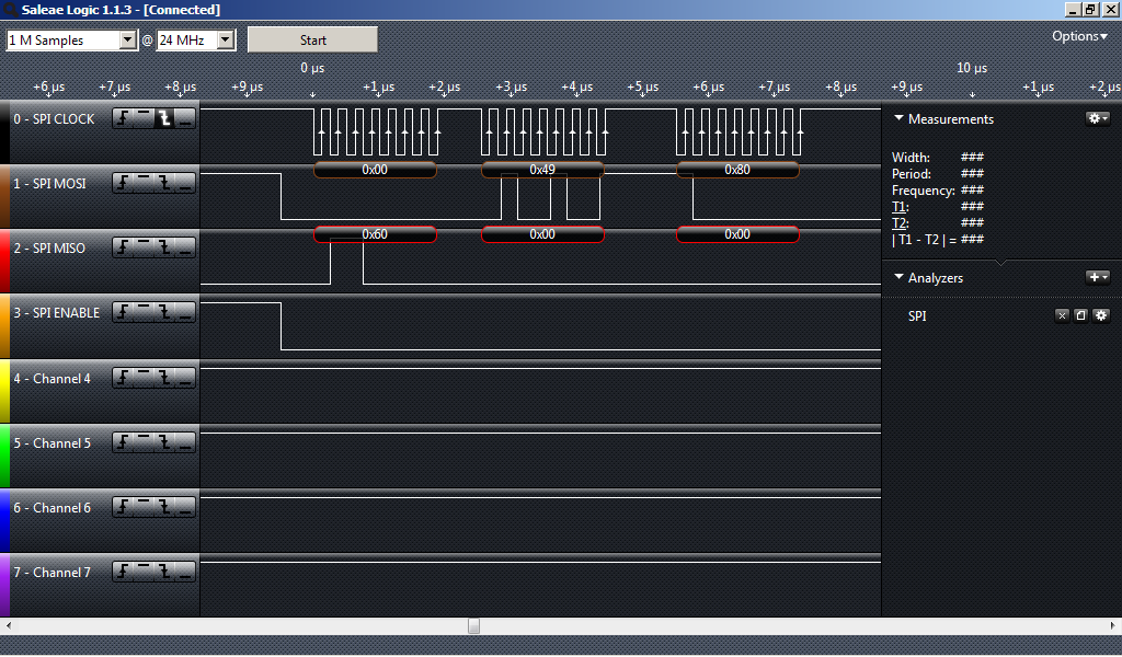 Something that would have really helped doing this was spying on the SPI bus with a logic analyser. Using an oscilloscope is okay, but it can be hard to track what you’re seeing if you don’t have storage. Although I figured out my bit-bang issues before it showed up, I broke down and bought a Saleae Logic Analyser. I hooked that shit up and it worked exactly as advertised. I should have bought it sooner.