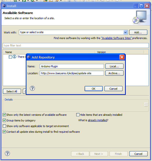 I’m standing on the shoulders of giants here. I’ve developed none of the software/plugins involved. I just put the pieces together from some disparate sources, some of which are a little out of date. The real credit goes to the authors of the software used in this. I did the setup on Windows and Linux, and the steps are 90% the same. I haven’t tried any of this out on OSX. This worked for me, maybe it will work for you. Maybe it won’t. I did this with Arduino IDE 1.0 installed.