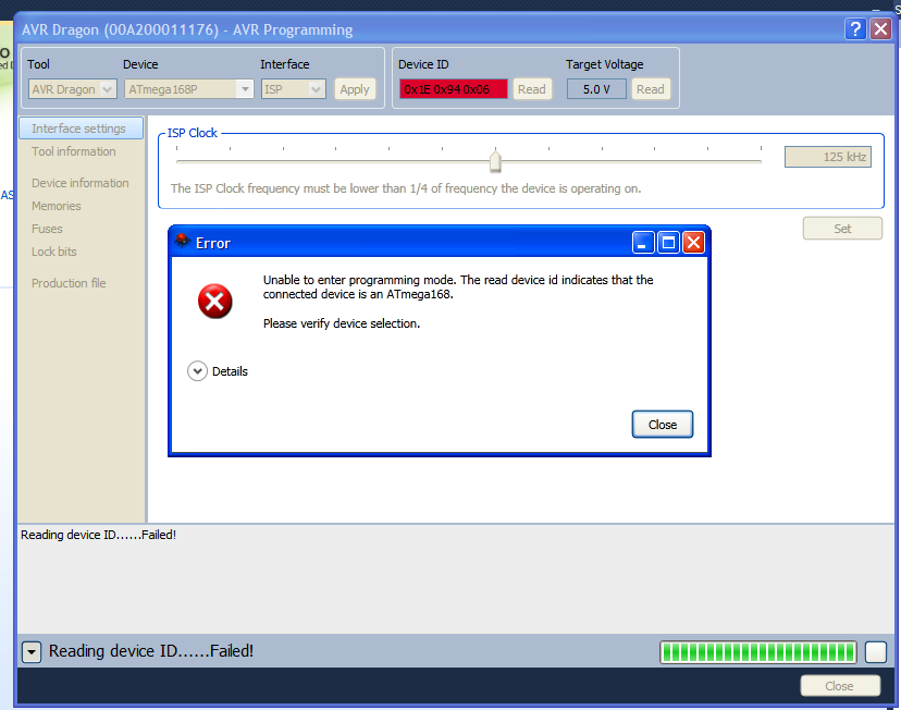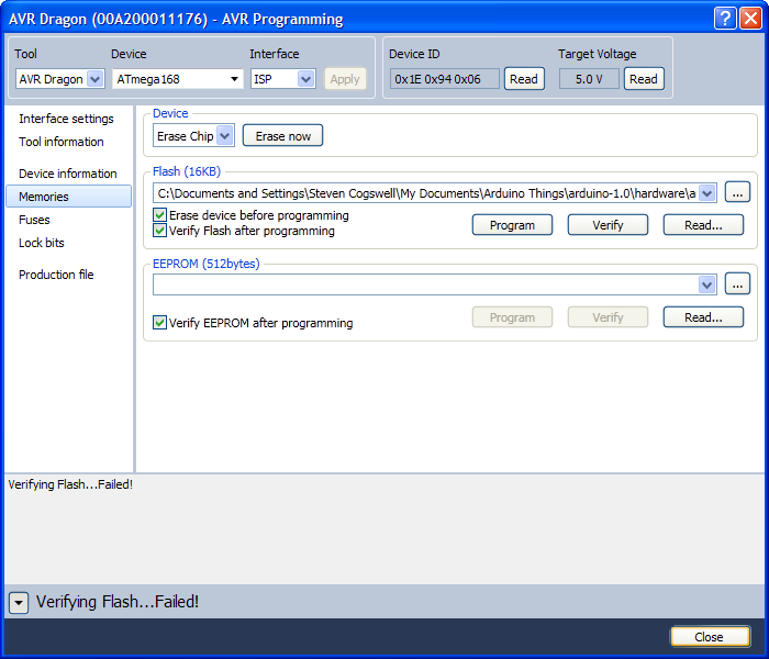 You should be able to connect to your Dragon, and read the fuses on the chip. The nice thing about AVR Studio 5.1 is the programmer will tell you the correct chip if you’ve picked the wrong one. On my Diecimila it’s an ATMega168.