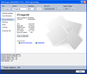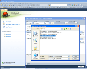 You’ll also want some version of AVR Studio. In this I used 5.1 but I know it works with AVR Studio 4, since my previous article involved Studio 4. The thing to note is that v4.x and v5.x want different versions of the Dragon firmware, so if you want to go back and forth between 4.x and 5.x you’ll have to keep re-flashing the Dragon too. That’s a pain in the ass.