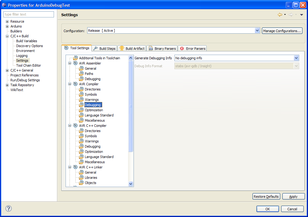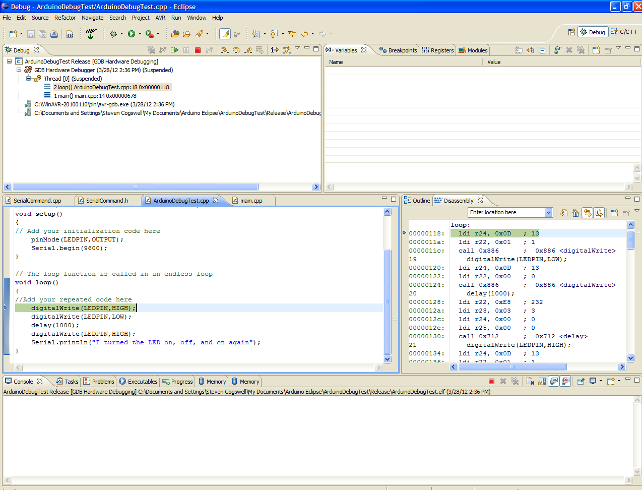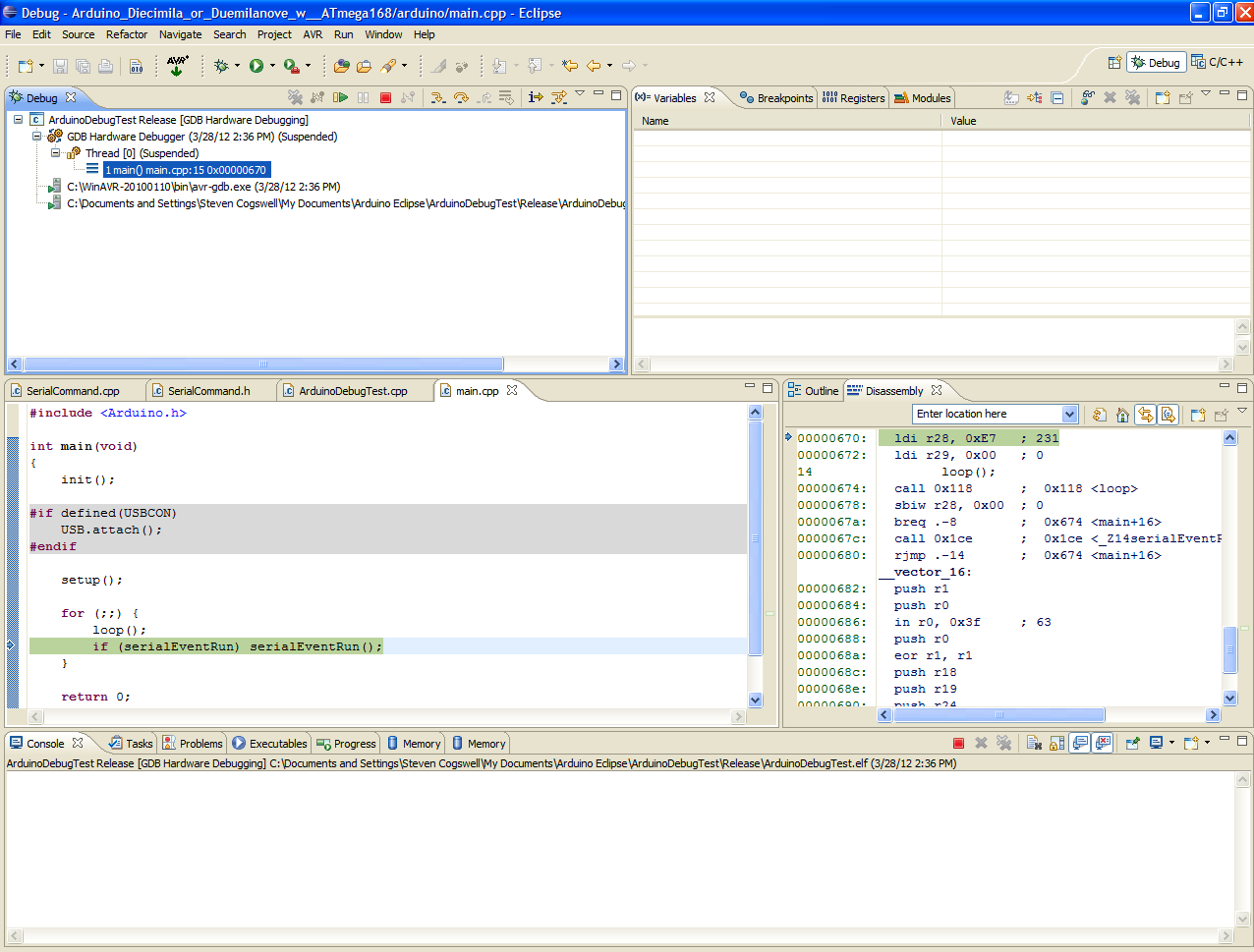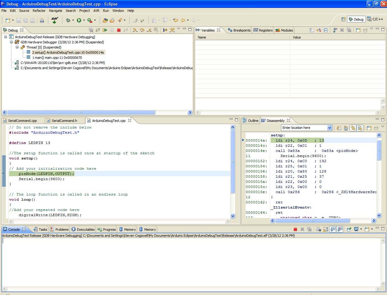 I’ve written before about using an Atmel AVR Dragon to debug an Arduino board, using AVR Studio 4. I recently had some communication from Stephen Lake where he mentioned he was using Eclipse for Arduino development. I’d looked at Eclipse a long time ago and setting it up was an absolute terror with no real benefit. Stephen said it was much easier now, so I figured I’d have a look. Along the way I found the toolchain is robust enough these days to support DebugWIRE debugging of the Arduino and not have it suck too hard. I spent a lot of time trying to get the setup right, so I figured I’d detail it out if you’re trying to figure it out too, and save you the effort.