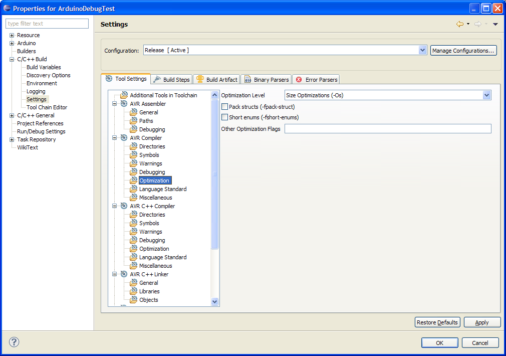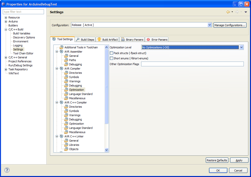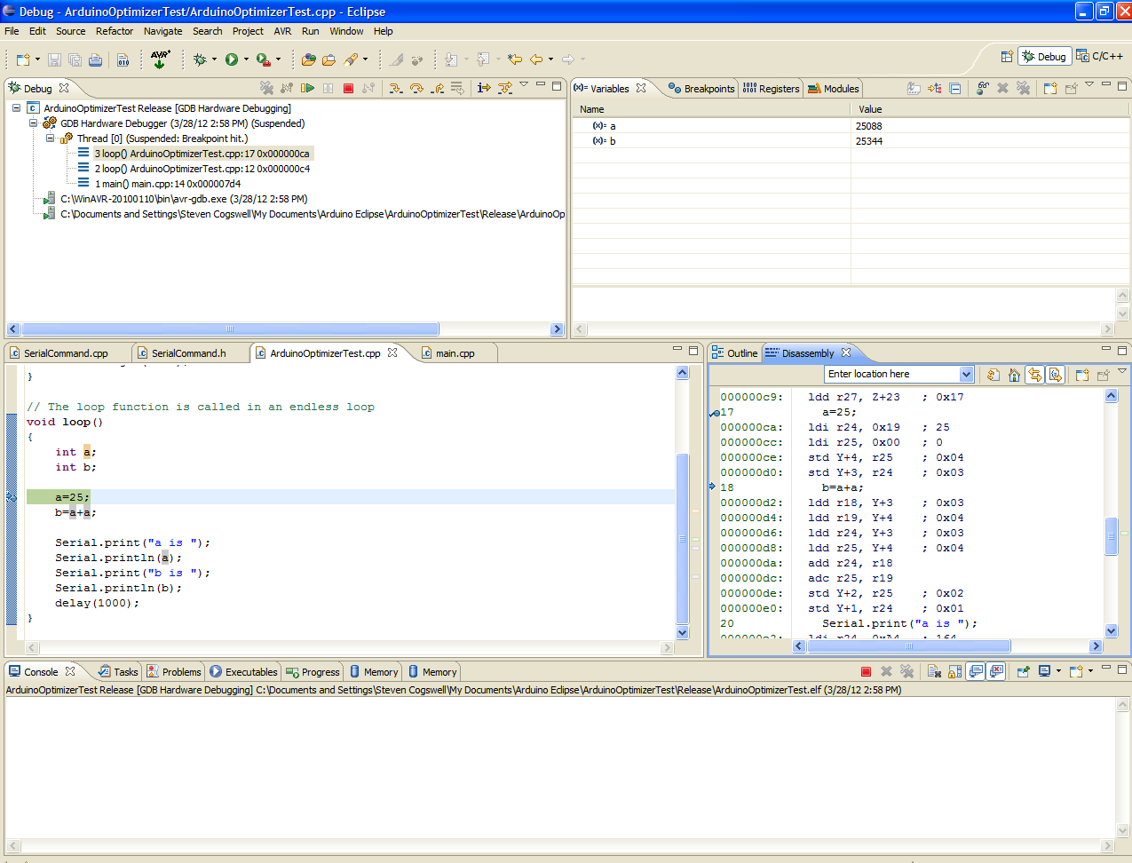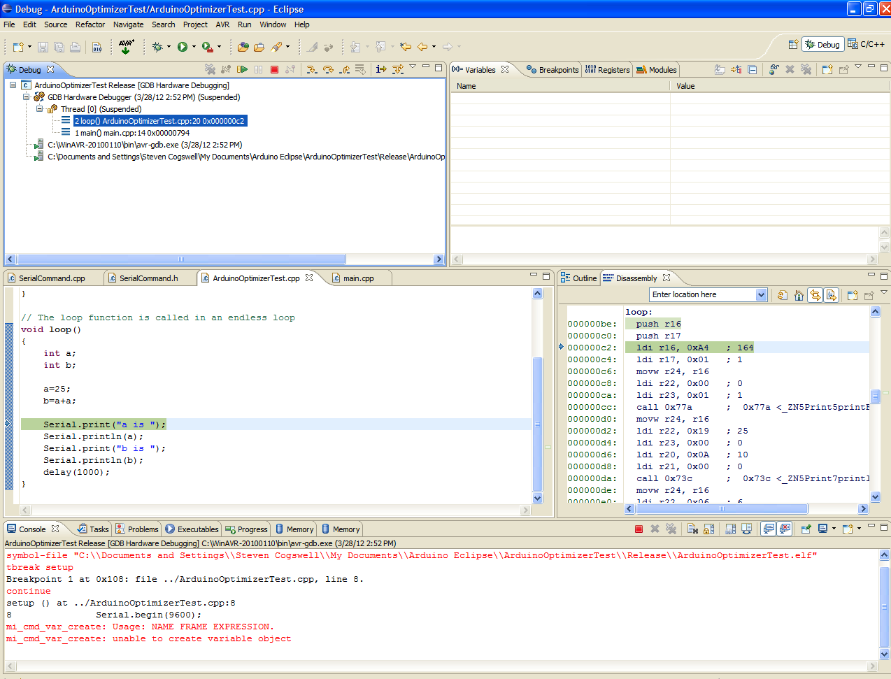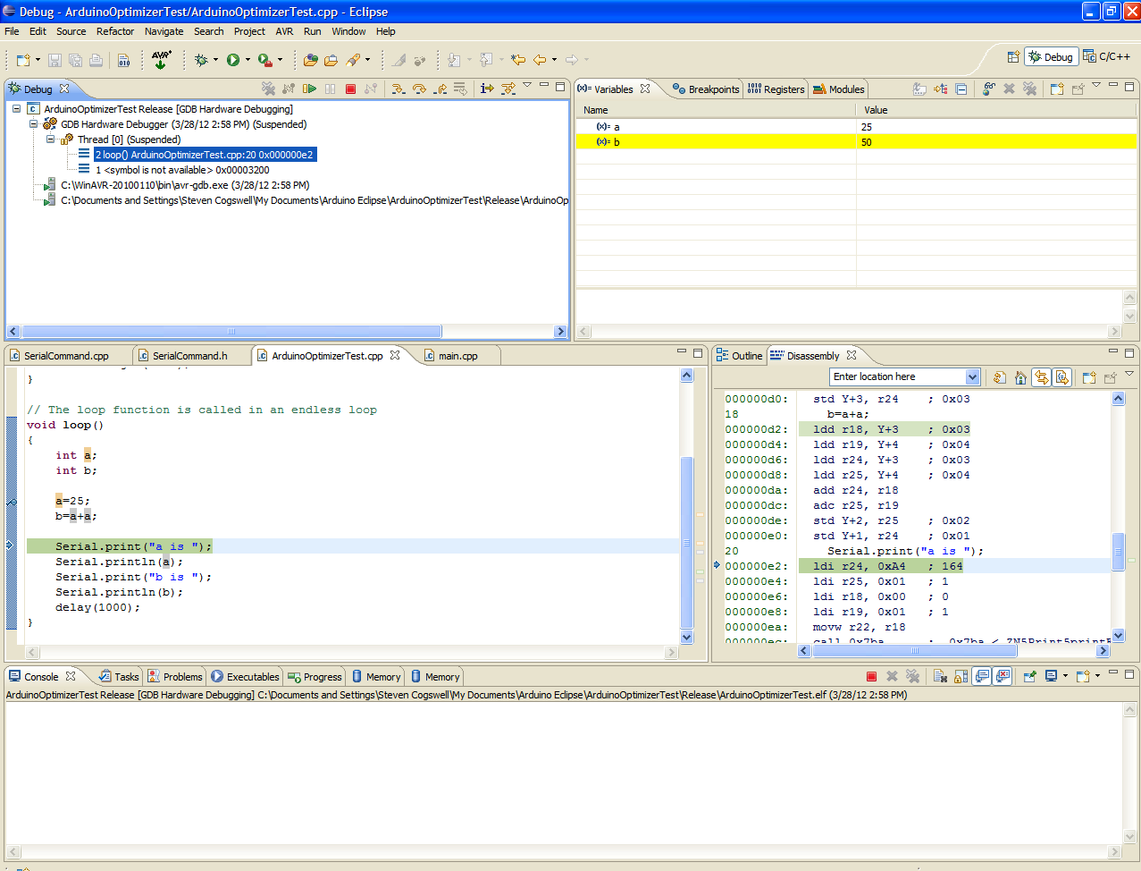 I’ve written before about using an Atmel AVR Dragon to debug an Arduino board, using AVR Studio 4. I recently had some communication from Stephen Lake where he mentioned he was using Eclipse for Arduino development. I’d looked at Eclipse a long time ago and setting it up was an absolute terror with no real benefit. Stephen said it was much easier now, so I figured I’d have a look. Along the way I found the toolchain is robust enough these days to support DebugWIRE debugging of the Arduino and not have it suck too hard. I spent a lot of time trying to get the setup right, so I figured I’d detail it out if you’re trying to figure it out too, and save you the effort.