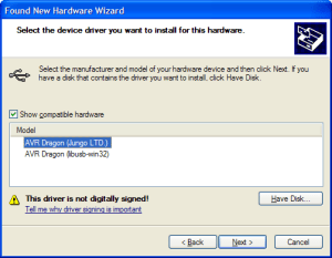 From here on out, if you’re going to go back and forth between AVR Studio and the WinAVR-style toolchain you’ll have to learn how to switch between the Jungo driver and the libusb driver. It’s pretty easy. With your Dragon attached, bring up the device manager. Select whatever driver is currently installed, right-click and select “uninstall.” Don’t worry, this doesn’t remove anything, the driver sticks around on your computer. The driver will disappear from the device manager list. Unplug and re-plug in your Dragon via USB and you’ll see the Windows “found new hardware” message. Walk through the Install New Hardware wizard, but don’t let it automatically install anything. Choose “Install from a list or specific location”, and “Don’t search. I will choose the driver to install.” Then you’ll get to pick between the Jungo driver and the libusb driver.