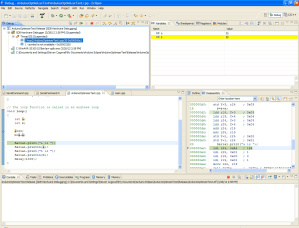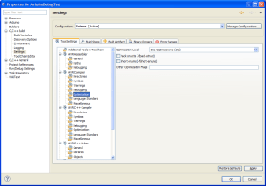 As of this writing, the versions were gcc-avr (1:4.5.3-2), binutiles-avr (2.20.1-2), gdb-avr (7.2-1), avr-libc (1:1.7.1-2), avrdude (5.10-3), avarice (2.10-3ubuntu1). Like WinAVR, there are newer versions available but the stock ones worked (I did build avarice 2.12 to test, didn’t make any difference in what I saw). I also had the stock Ubuntu 11.10’s OpenJDK for Eclipse.