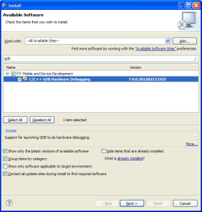 More specifically, Eclipse IDE for C/C++ Developers (includes Incubating components). At the time of this writing Eclipse was 3.7.2. The nice thing about Eclipse is that it doesn’t have to be “installed” on your system, you can just unzip the folder and run it from that. That means you can keep many, many different versions of Eclipse configured for different tasks like I do around and not have to worry about trying something that will foul it up in some other aspect. I started out with the base CDT version and added into it. You’ll also need Java for this, of course, since Eclipse requires Java to run. Hey, I hear Eclipse can be used for Java development. groan.