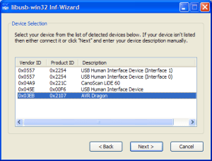 If you install one of your AVR Studio (v4 or v5), it will install the AVR Dragon USB driver. That’s great. The Dragon works fine in AVR Studio. Problem: nothing else will. The WinAVR stuff won’t talk through the Jungo driver to the Dragon. Instead, you’ll have to install libusb-win32 to provide an alternate usb access that the WinAVR stuff can work with.