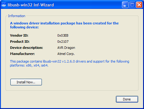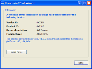 With AVR studio installed, and your dragon attached, you can check in the Windows device manager that you have a driver for “Jungo” in play, and the AVR Dragon is associated with it. Unzip the libusb-win32 stuff, and look inside for the “install-inf.exe” program. If you run that, this will make a very nice .INF style installer for your Dragon that uses the libusb driver.