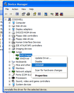 Difficulty: when you install the libusb stuff, the Jungo driver is not active, and so AVR Studio doesn’t work with the Dragon. So if you’re like me and you keep popping back and forth between environments, you have to keep changing the driver. The good part is, it’s easy to do, it’s just busyness. There may be an alternate way to make this work, but I couldn’t find it.