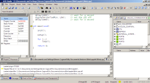 This is important, because microcontrollers like the ATMega168 don’t ‘speak’ C, they speak assembler opcodes. When you program it you’re downloading a bunch of assembler hex bytecode that actually makes the chip operate. AVR Studio lets you jump one step back and use your GCC source code to step through program operation on the chip.