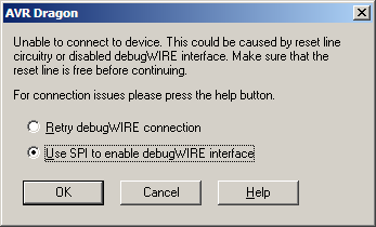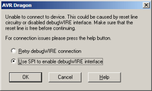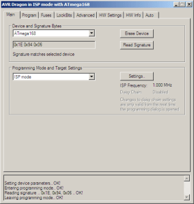 Then it’s just a matter of hooking up the Dragon and configuring it in AVR Studio. Configure your project to use the AVR Dragon (not the Simulator) and set the installed chip type correctly (ATMega168 in this case). “Select Platform and Device”. .