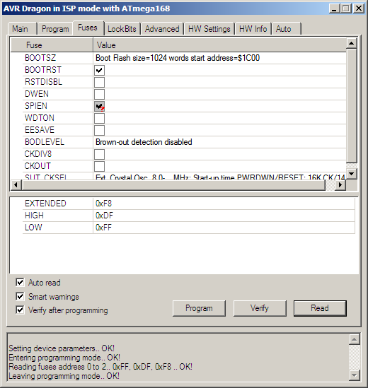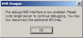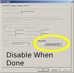 Protip: To get the chip out of DebugWIRE mode, you just have to start a debug session with the Dragon in place. You don’t have to have the actual code that’s on the Arduino at the moment. Just load up something (like the blink.cpp.elf project), go into the Dragon options and just disable DebugWIRE. Presto, good as new. Someday Atmel may fix this deficiency in AVR Studio, but this works for now.