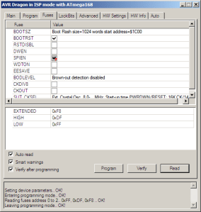 If you’re like me, and you accidentally did goober your chip up, you can pull the chip and put it into another programmer (like your Dragon, if you’ve outfitted it with the sockets, or an STK500 in my case) and use the high-voltage programming mode. HVPP mode doesn’t care about SPI being enabled or not, and is how I saved myself every time I did a “whoops, screwed that up, time for a reset” while figuring all this out. This is where those fuses are important. If you use HVPP and muck up the fuses for bootloader and boot reset configuration, the Arduino’s Bootloader will mysteriously work exactly once and never again, making you reflash the bootloader code. I know, I did that. The bootloader code is in the Arduino software directory, with a .hex for your particular board. You can reflash it to the chip with AVR Studio.