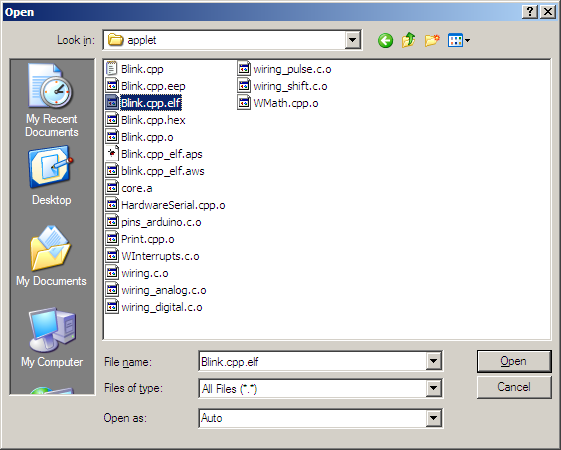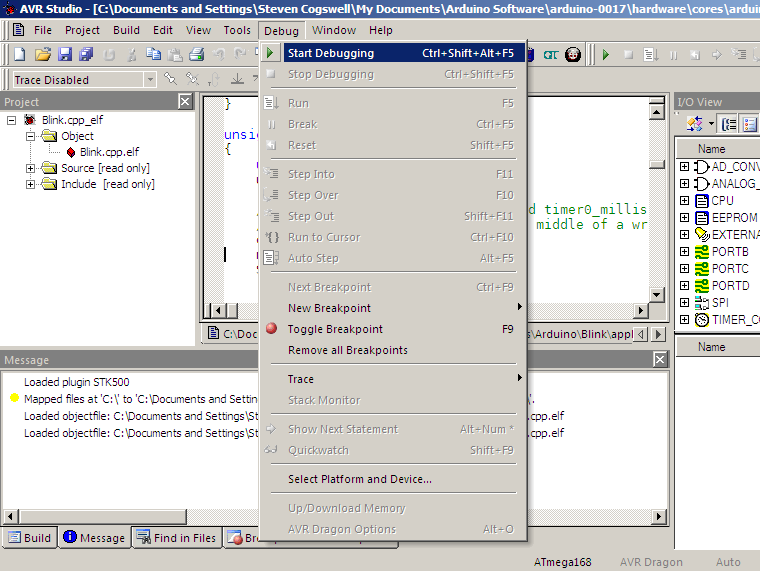 So this means – you compile your code in Arduino’s IDE, then you load the compiled project into AVR Studio. In AVR Studio 4 you open an existing file, navigate into the subdirectory called “applet” under where the “Blink.pde” source was saved, and open the file that ends in “.elf” ELF is a format that AVR can use to “connect the dots” between the .hex you loaded onto the Arduino, and the Arduino (secretly C/C++) source code you actually wrote. AVR Studio will want to save your project as a new project, which you should.