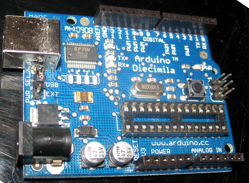 At the time I did that post I had Duemilanove’s in my posession but I was doing the project with the Diecimila, so I didn’t really go into that board. The Duemilanove has the advantage of not having to change a jumper for the DC power/USB power, as it auto-switches.