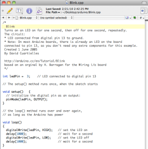 So let’s consider getting setup for a DebugWIRE session on the Diecimila. We’ll use this boring demo code from the Blink demo that everyone can understand: