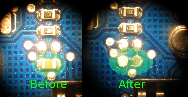 As lots of people will tell you, hand-soldering with surface-mount components is a pain. Luckily you don’t have to solder anything onto the board, you just have to remove the one there. I did it my favourite way, which is looking down a stereo dissecting microscope – which you can buy off eBay for a hundred bucks. If you’re going to solder small things and you’re half-blind like I am, a microscope is worth it.