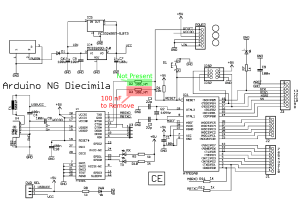 So I figured, I spent my $57.74, and I have some time, I’d see if this assertion was correct. I tracked down in the schematic (shown above) and from the Diecimila page what component would have to be removed. I couldn’t trace very well on the nice little board itself, so I dug out the schematic in Eagle and made sure of the location of the capacitor to be removed in the board layout. (Aside: Eagle is nice, free to use for small things, cheap for non-profit hobby folks).