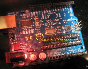 One of the nice things the Arduino does for the casual user is eliminate the need for fussing with bootloaders and external programming hardware. One trick it uses is to trigger the RESET line via the USB controller chip – this way when you go to “Upload” your program from the Arduino IDE it issues a board reset (thus activating the bootloader) and slurps up your code over USB. The problem: it does this by tying one of the USB FTDI chip serial control lines to the ATMega168 RESET line via a 100 nF capacitor.