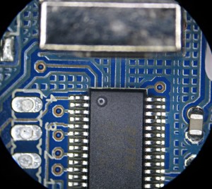 So, a quick trip under the microscope. I took out the Atmel microcontroller from the board (it’s in a socket, hey hey smart people) to make sure I didn’t destroy it by accident. Heat up the pad with the iron, use a little soder-wick, use a little pressure and the capacitor pops off. You could use a vacuum desoldering gun, one of those spring-loaded jobs, or you could probably just cut the capacitor in half with an x-acto knife if you’re so inclined, I suppose.