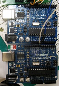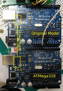 Old Duemilanove on Top, ATMega328 Version on bottom