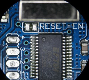 Yep, the newer ATMega328 version of the board (which shouldn’t be any different other than the chip plugged in the socket) is missing those “RESET-EN” pads. That’s disappointing.