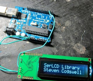 In the library I (tried) to implement all the features of SerLCD. I’ve only tested it with the 16×2 display though, so your mileage may vary. I didn’t include anything towards changing the SerLCD bootup splash or resetting the baud rate, since you have to do those when the SerLCD is first powering up and I didn’t want to be bothered. The only issue I encountered with the SerLCD v2.5 firmware seems to be that it would lock up until powered off/on again if you hammered backlight control commands at it too fast. I put a couple of delay() statements in the backlight settings and haven’t have problems.
